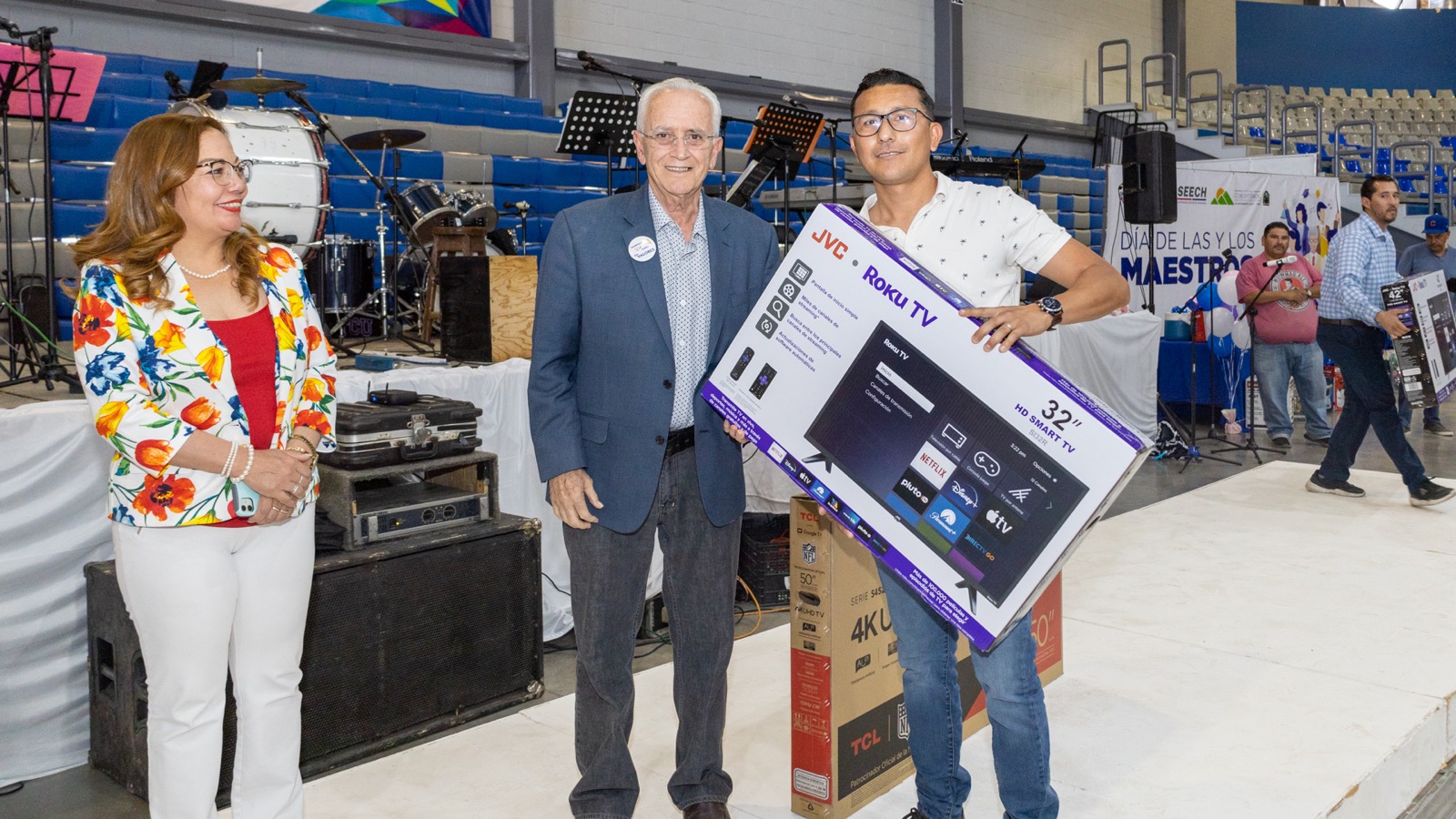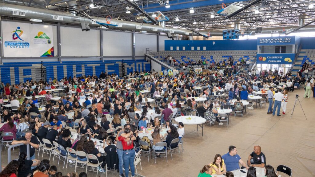 Cd. Cuauhtémoc, Chih.- El alcalde Beto Pérez encabezó un evento de celebración para los maestros estatales y federales, que se realizó en el Poliforo de Cuauhtémoc, en el que hubo mariachi, comida, danza y rifa de regalos, con motivo del Día del Maestro.