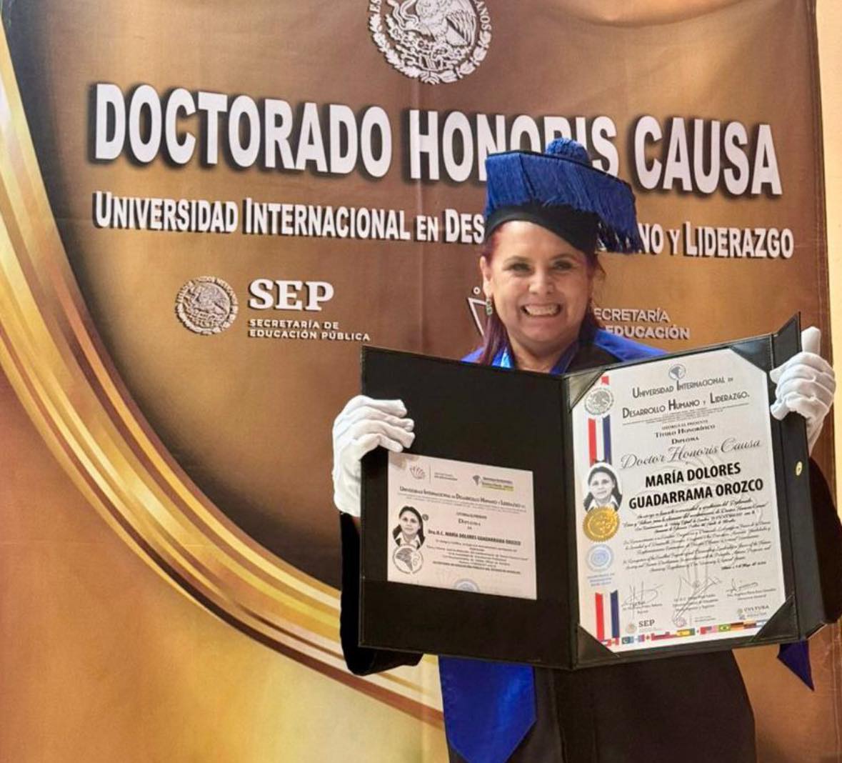 El prestigioso título “Doctor Honoris Causa” otorgado por la Universidad Internacional en Desarrollo Humano y Liderazgo a personas eminentes fue concedido a María Dolores Guadarrama Orozco.