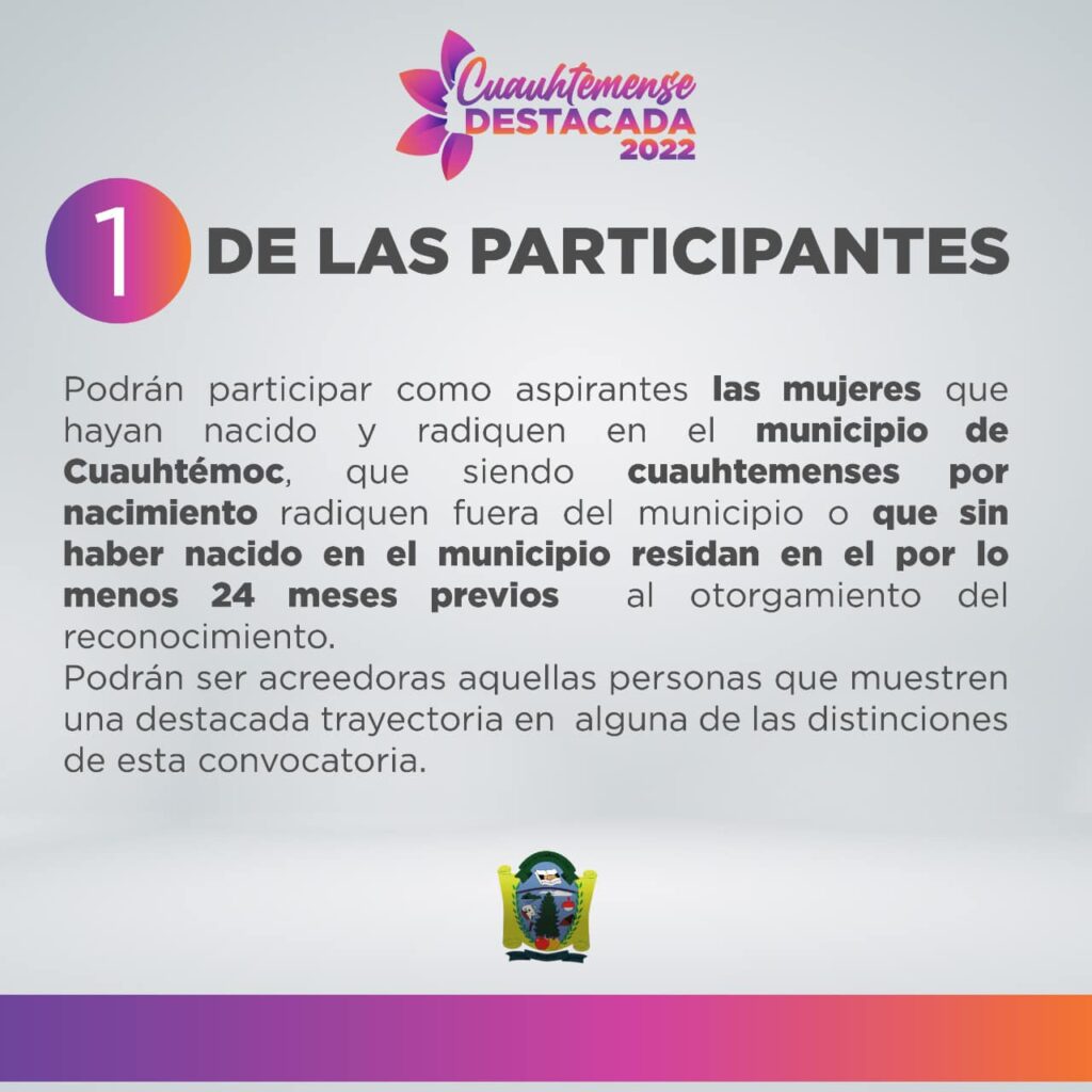 Cuauhtémoc, Chih.-El Honorable Ayuntamiento de Cuauhtémoc a través de la Comisión de Familia, Mujer e Igualdad de Género, y el Instituto Municipal de las Mujeres, convocan a participar en el premio “Cuauhtemense Destacada 2022”.