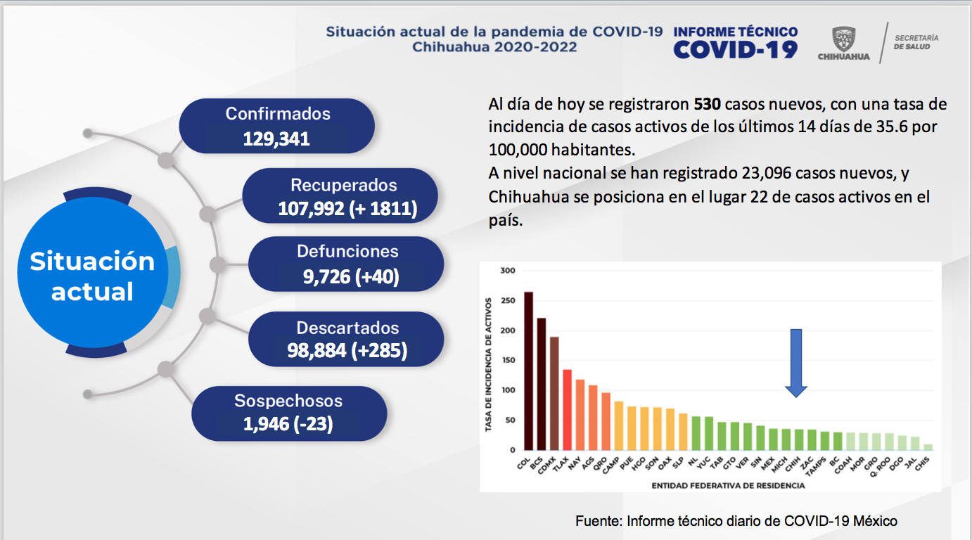 A nivel nacional se registraron 23 mil 096 casos nuevos y el estado de Chihuahua se posiciona en el lugar 22 de casos activos en el país, de forma que posee una tasa de incidencia de los últimos 14 días de 35.6 por ciento por cada 100 mil habitantes.