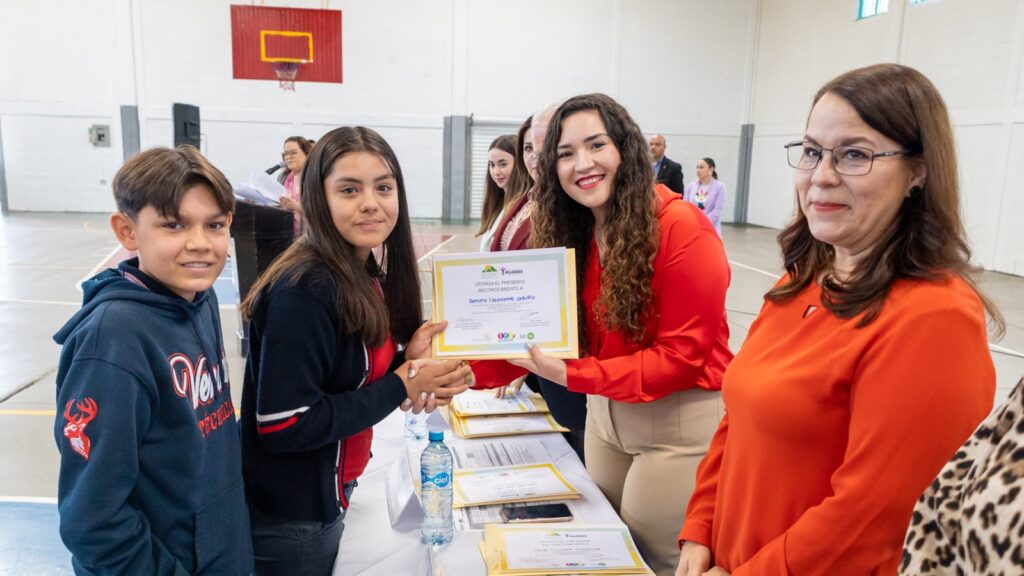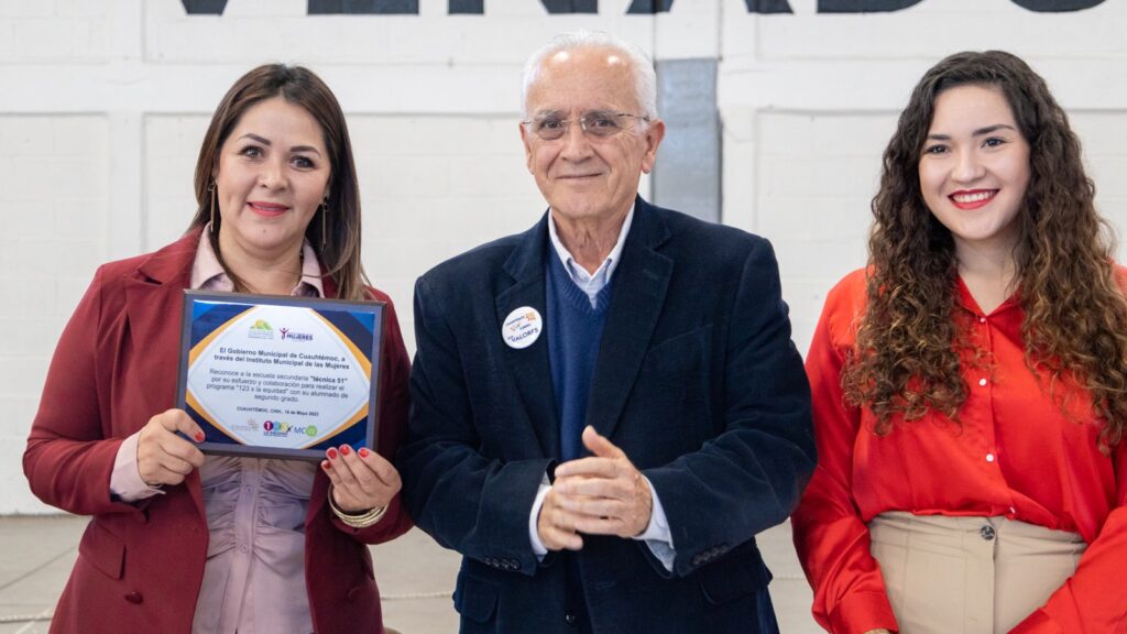 Cd. Cuauhtémoc, Chih.- 300 estudiantes del segundo grado de la Secundaria Técnica 51, se graduaron del programa “1, 2, 3 por la equidad”, que imparte el Gobierno Municipal de Cuauhtémoc a través del Instituto Municipal de las Mujeres.