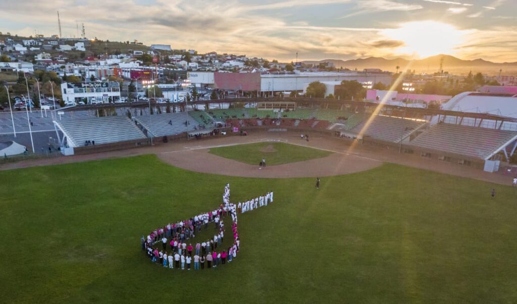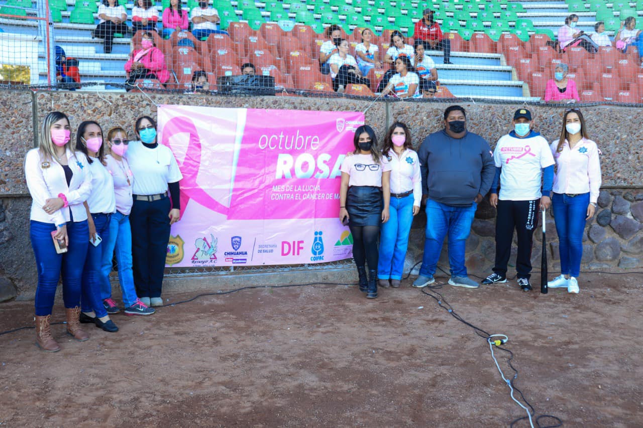 Cuauhtémoc, Chih.- Beisbolistas de primera fuerza se vistieron de rosa para aportar a la prevención del cáncer de mama. En conjunto con el público que asistió al disfrutar el encuentro deportivo y servidores públicos, formaron en el diamante un lazo humano, para fomentar la conciencia sobre esta enfermedad, que es la primera causa de muerte entre las mexicanas.
