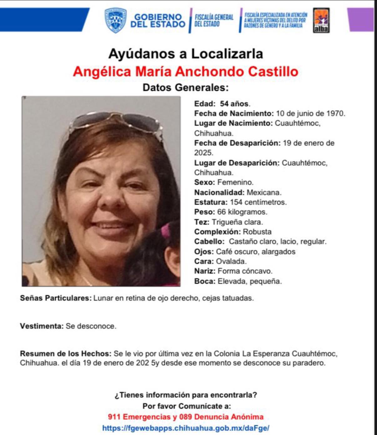Cuauhtémoc, Chih.-La Fiscalía de la zona occidente emitió la pesquisa para tratar de encontrar a Angélica María Anchondo Castillo, de 54 años de edad, quien desapareció en Cuauhtémoc desde el pasado domingo 19 de enero.