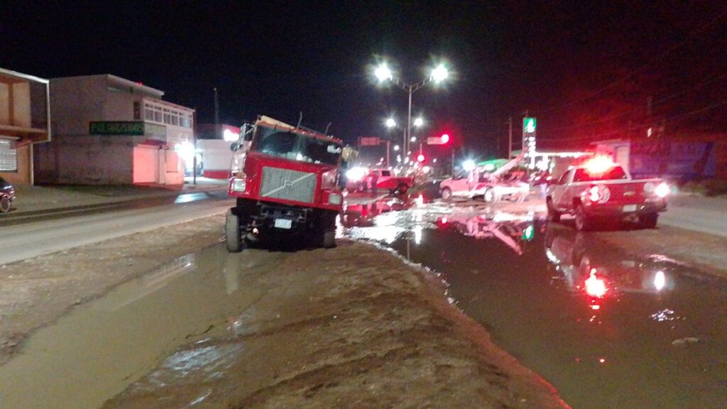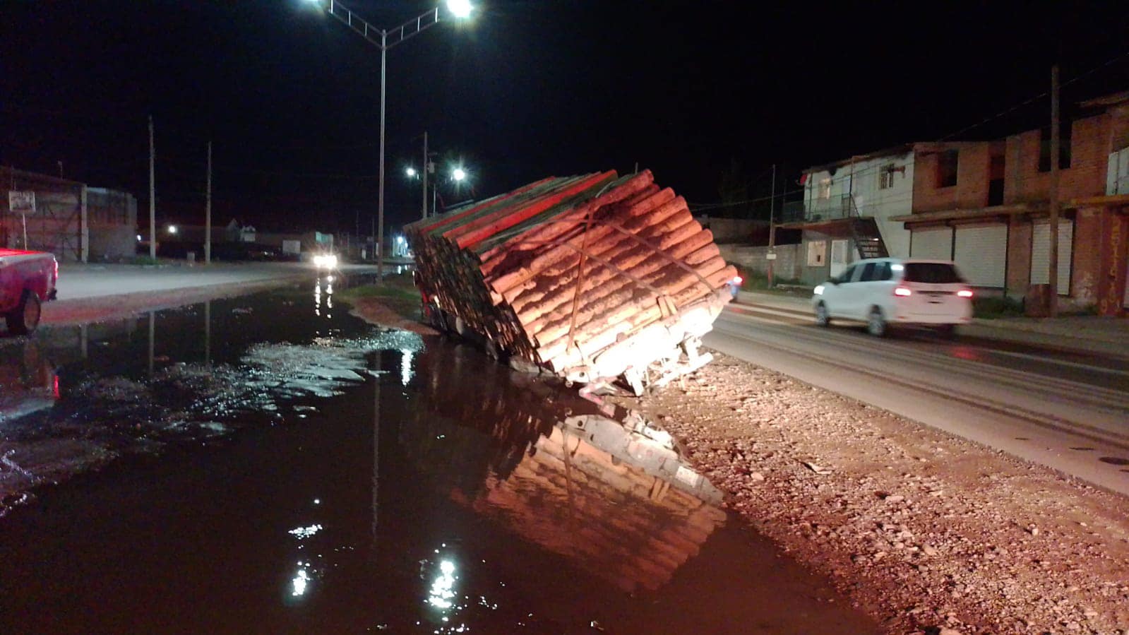 Cuauhtémoc, Chih.-Un tractocamión quedó atascado en el camellón central de la vialidad Jorge Castillo Cabrera, a la altura de la colonia Tierra Nueva, en donde debido a las lluvias, se ablandó la tierra, formando un hundimiento.
