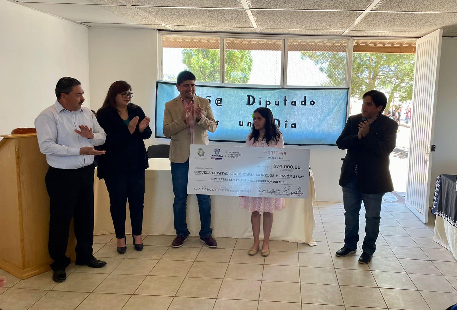 *El premio será utilizado para mejoras en el plantel.El diputado del PAN, Saúl Mireles, visitó a la niña Diputada Infantil que representará al distrito 14 en el Congreso del Estado. Se trata de Elva Vicuña Cano de la Escuela Primaria José María Morelos y Pavón #2582 de Cuauhtémoc, quien el próximo 28 de abril ocupará una curul en el Pleno del Palacio Legislativo.