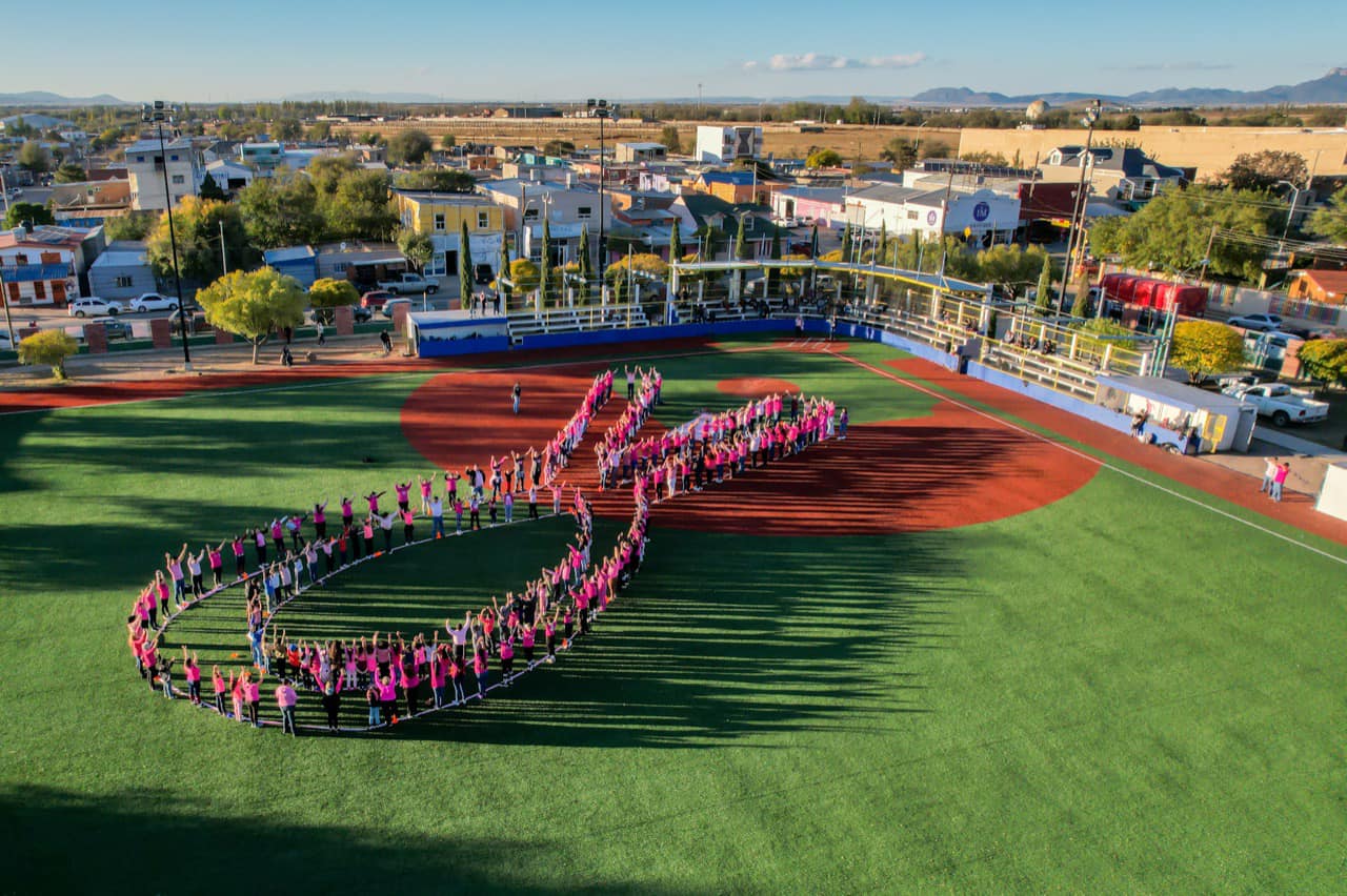 Cuauhtémoc, Chih.- Un gran moño rosa se conformó por personas que se pusieron la playera rosa, con motivo del 19 de octubre, Día Internacional de la Lucha contra el Cáncer de Mama.