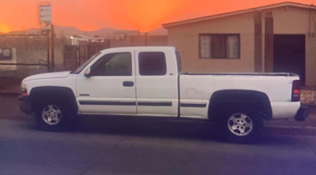 Es una pick up Chevrolet Silverado, 1500, color blanco, cabina y media, placas del estado de Chihuahua, no recordó el número. Como característica particular, la pick up tiene la coraza puesta con tornillos.