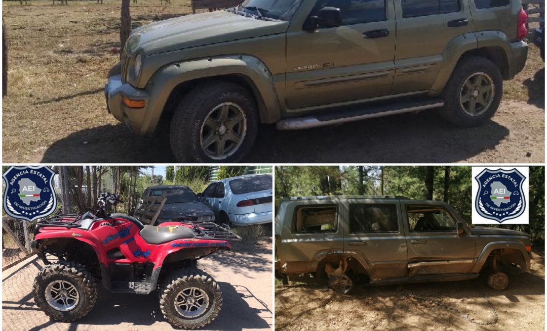 Uno de los vehículos es una Jeep, Commander, color gris oscuro que cuenta con reporte de robo del día 08 de diciembre del 2018 en Ciudad Madera. Dicha unidad fue encontrada en una brecha como parte de las acciones de búsqueda de personas desaparecidas en ese municipio.