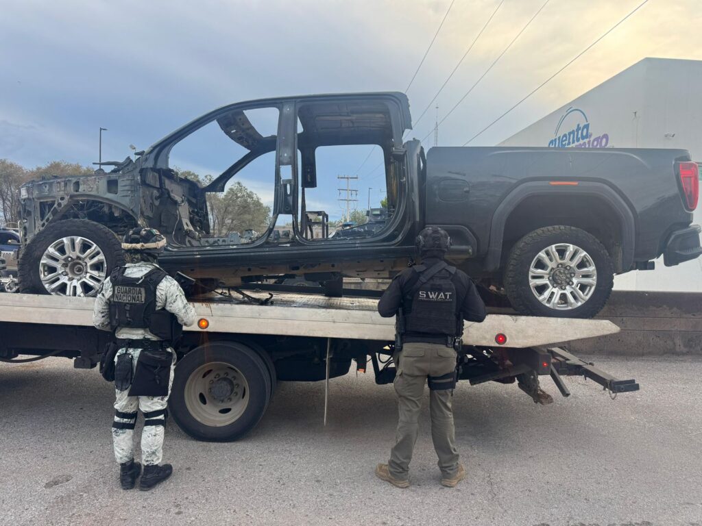 Al verificar sus datos en la base vehícular, se confirmó que una de las dos camionetas con blindaje artesanal, contaba con reporte de robo en el estado de Texas, por lo que se procedió al aseguramiento.