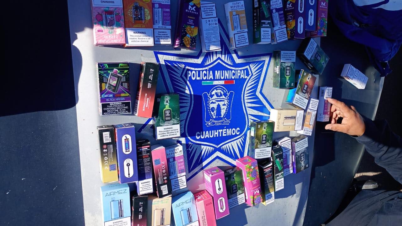 Tras ser interceptado, y en presencia de su abuela, se realizó una revisión de sus pertenencias, localizando 37 dispositivos de vapeo (vapeadores) y una cantidad de hierba seca con características similares a la marihuana.