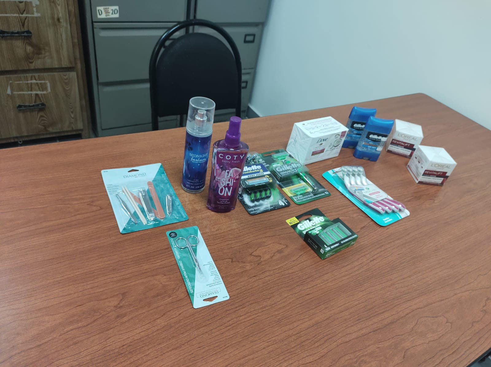 Se detuvo a Sayra G.D., de 31 años de edad, quien traía en su bolso de mano los siguientes objetos: dos perfumes, dos cremas antiarrugas, cuatro paquetes de rastrillos de la marca Gillette y Nice Care, un estuche de limpieza de uñas con 6 piezas, una pinza para cortar cutícula, un paquete de jabones Dove con cuatro piezas de 100 gramos cada una.