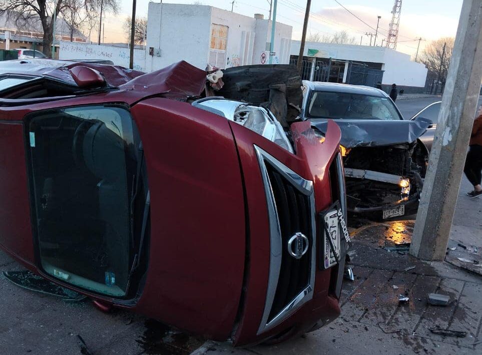 Tras la colisión, el Nissan Versa salió proyectado contra un establecimiento, causando daños en un vidrio de una puerta y quedando volcado sobre su lateral derecho.