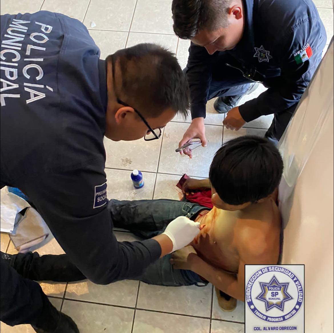 Al llegar al lugar, los policías tuvieron a la vista a un hombre que no pudo proporcionar sus datos generales pues estaba en estado de ebriedad. Se le apreciaron dos heridas cortantes en el pecho y dos más en la espalda.
