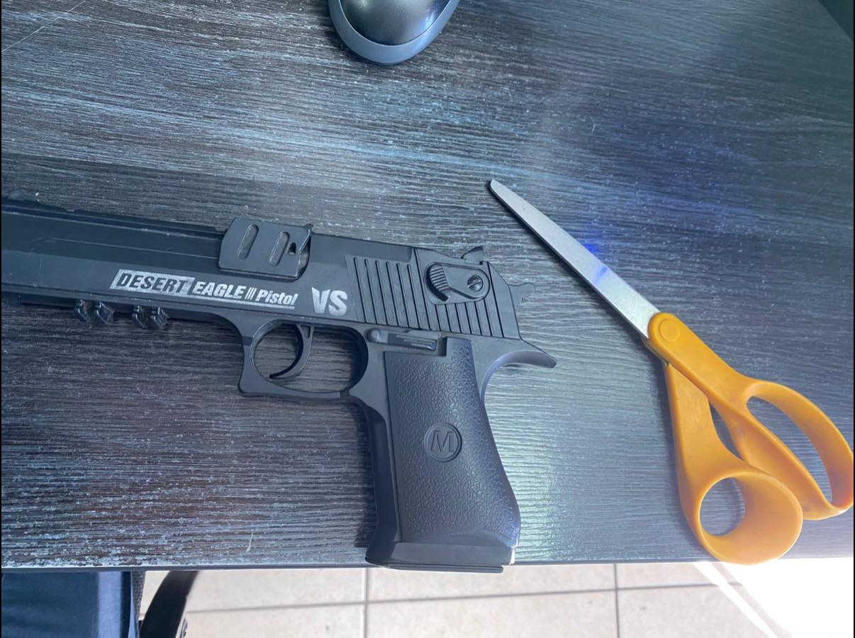 Al arribar al lugar, los agentes ubicaron a la persona señalada, quien tenía a un costado una arma de utilería tipo Desert Eagle en color negro, la cual fue asegurada. El detenido fue identificado como Obeth Alan D. C., de 22 años de edad.