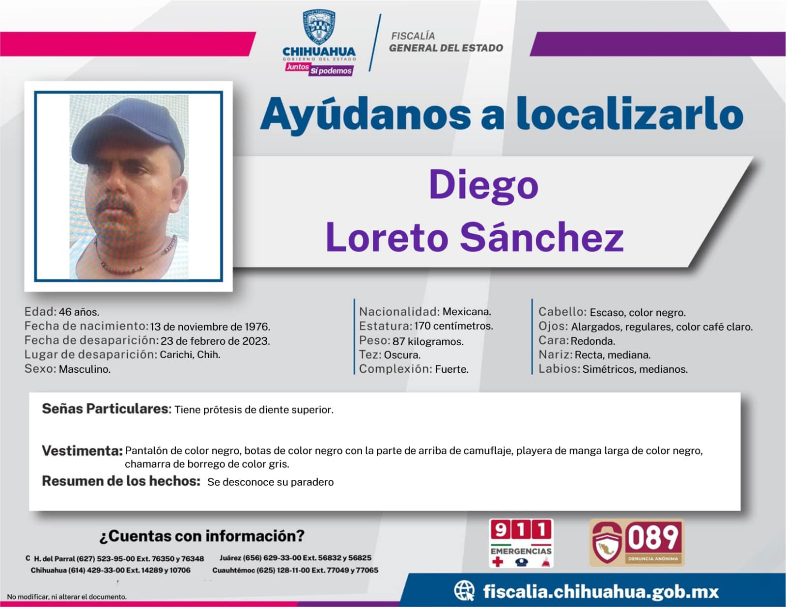 Cuauhtémoc, Chih.-La Fiscalía emitió este día la pesquisa para tratar de dar con el paradero de Diego Loreto Sánchez, quien desapareció desde el pasado 23 de febrero.