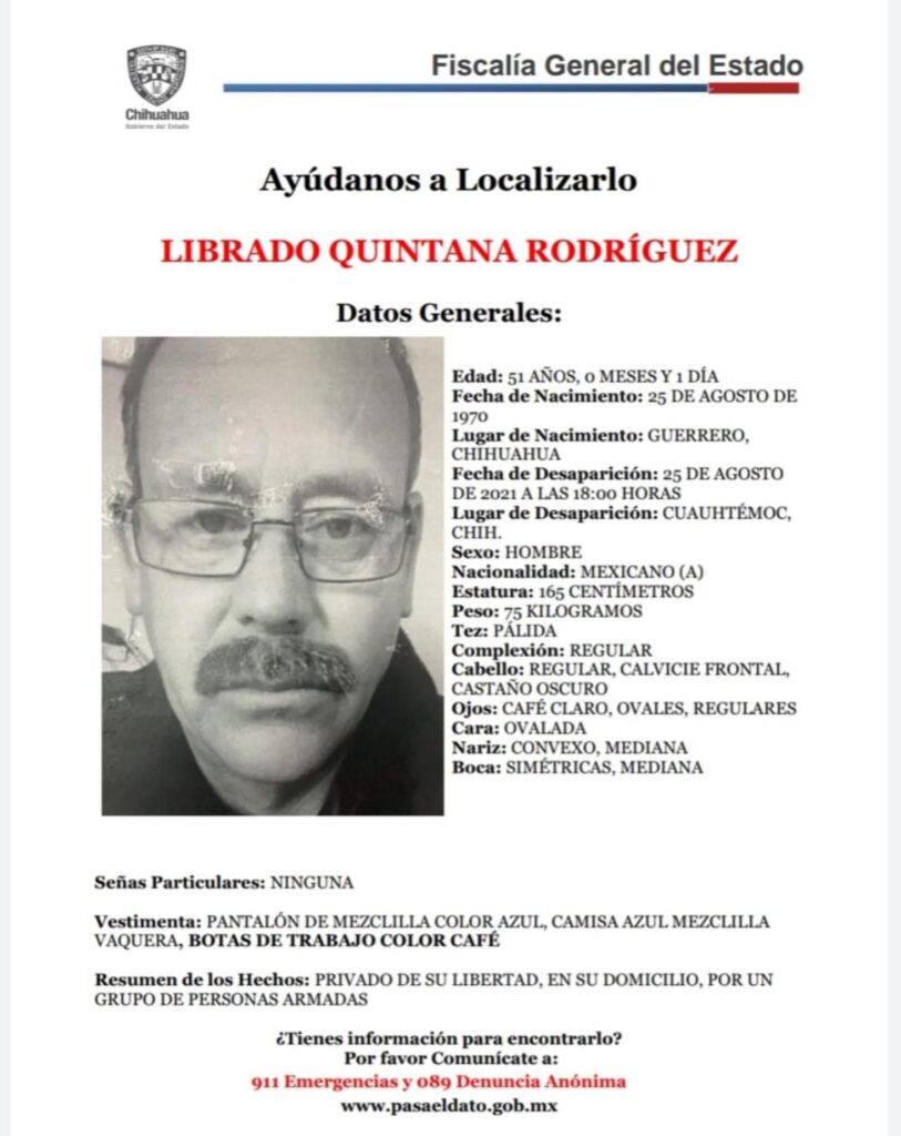 Cuauhtémoc, Chih.-La Fiscalía de la zona occidente emitió la pesquisa para tratar de dar con el paradero de Librado Quintana Rodríguez, quien fue privado de la libertad el día de ayer por parte de sujetos armados.
