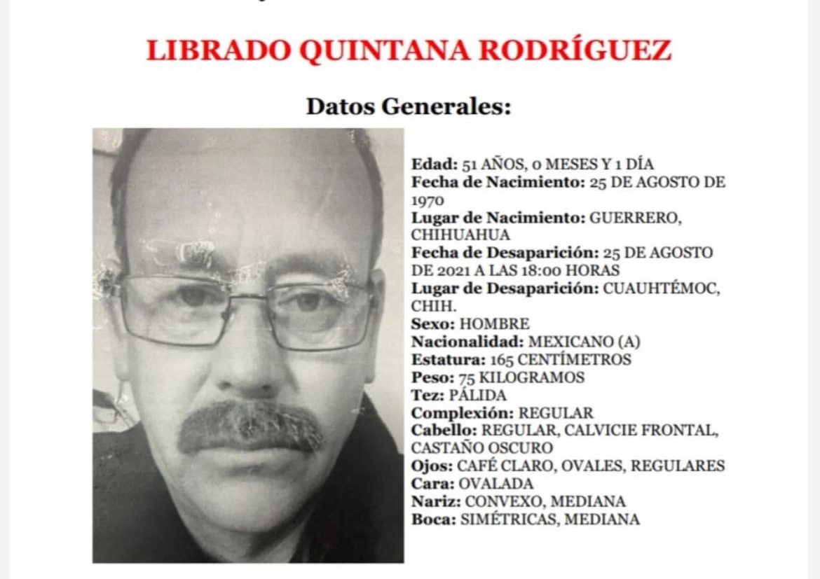 Cuauhtémoc, Chih.-La Fiscalía de la zona occidente emitió la pesquisa para tratar de dar con el paradero de Librado Quintana Rodríguez, quien fue privado de la libertad el día de ayer por parte de sujetos armados.