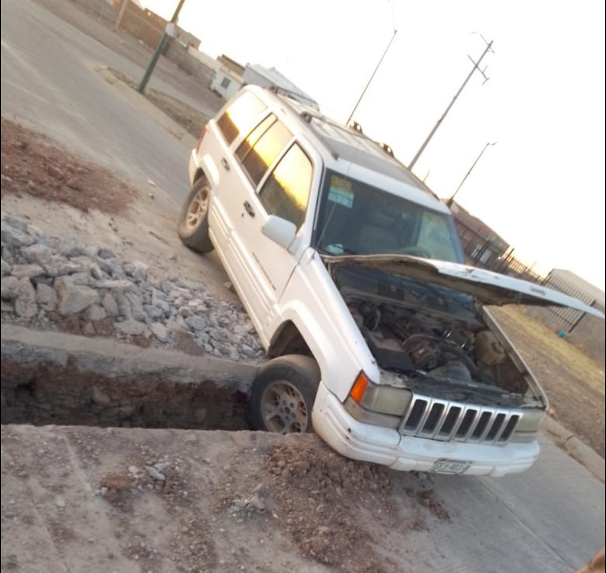 Cuauhtémoc, Chih.-La mañana de hoy se registró un accidente en las calles Xochimilco y 120, en donde un adulto mayor que conducía una camioneta de la marca Jeep línea Cherokee, cayó en una zanja causando daños en la unidad.