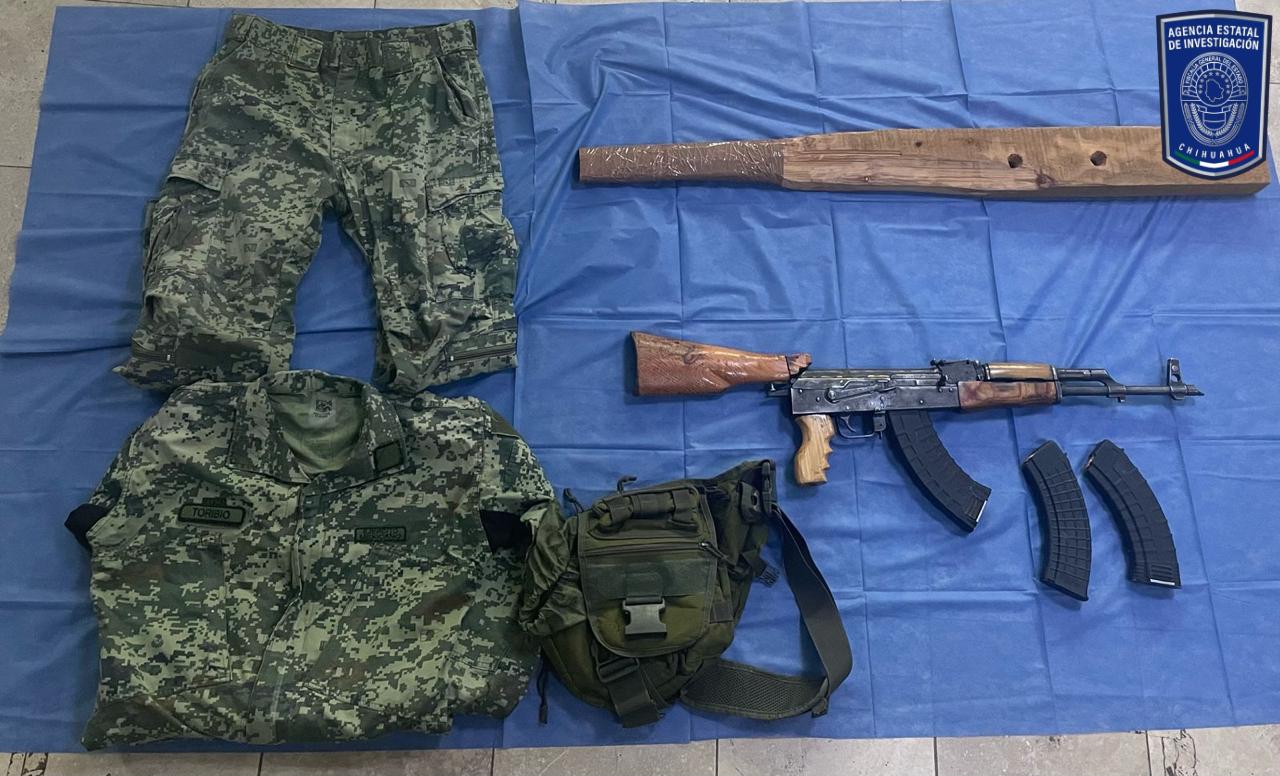 Elementos de la Agencia Estatal de Investigación, adscritos a la Fiscalía de Distrito Zona Occidente, encontraron un arma de fuego AK- 47 “Cuerno de Chivo” y ropa táctica dentro de un vehículo, en la colonia Los Alcaldes de la ciudad de Cuauhtémoc.