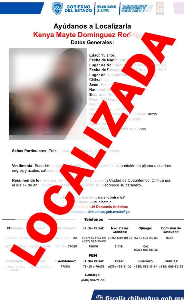 La Fiscalía Especializada en Atención a Mujeres Víctimas del Delito por Razones de Género y a la Familia en la Zona Occidente, localizó sana y salva a la adolescente de iniciales K.M.D.R., horas después de que sus familiares reportaron su ausencia este viernes.