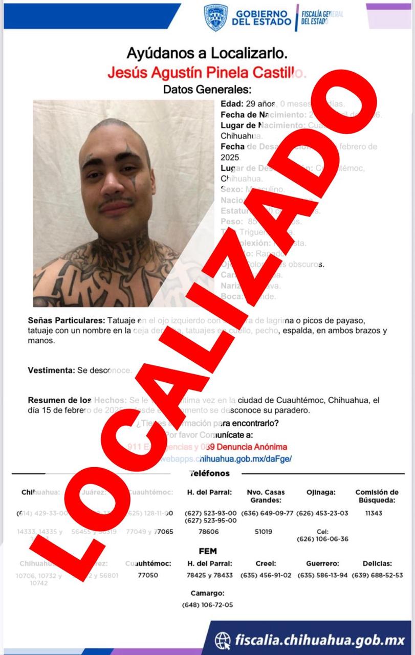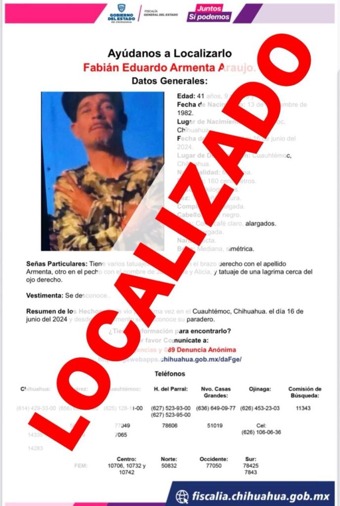 Fabián Eduardo A. A., de 42 años de edad, quien contaba con reporte de desaparición interpuesto el 27 de junio del 2024, declaró en la entrevista ministerial que el día 16 de junio del 2024 se trasladó al municipio de Ascensión en donde estuvo trabajando en actividades agrícolas y que su ausencia fue voluntaria.