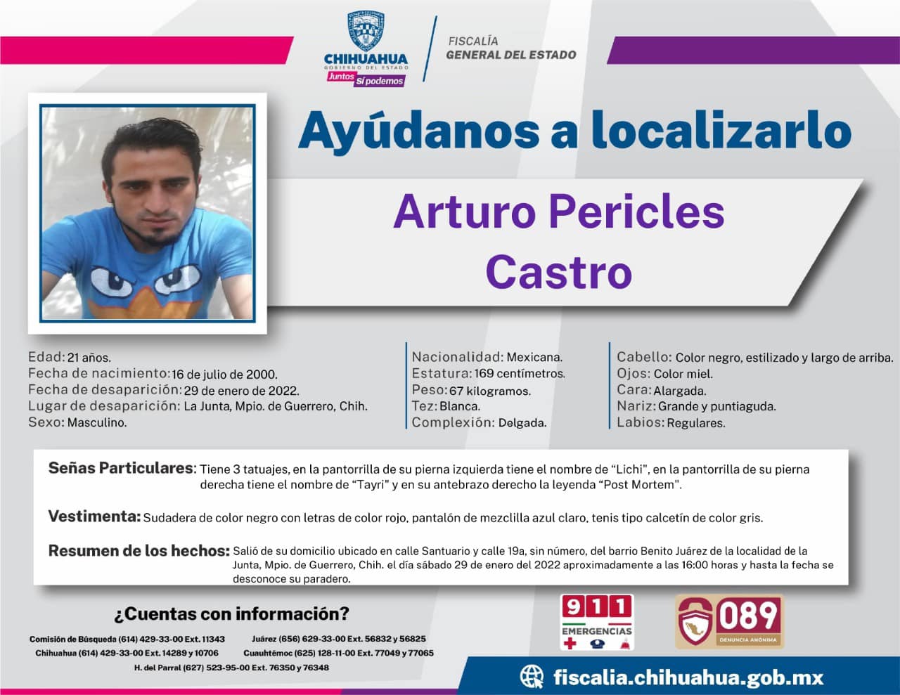 Cuauhtémoc, Chih.-La Fiscalía de la zona occidente emitió la pesquisa para tratar de dar con el paradero de Arturo Pericles Castro, de 21 años de edad, originario de La Junta, municipio de Guerrero, mismo que está desaparecido desde el pasado día 29 de Enero.
