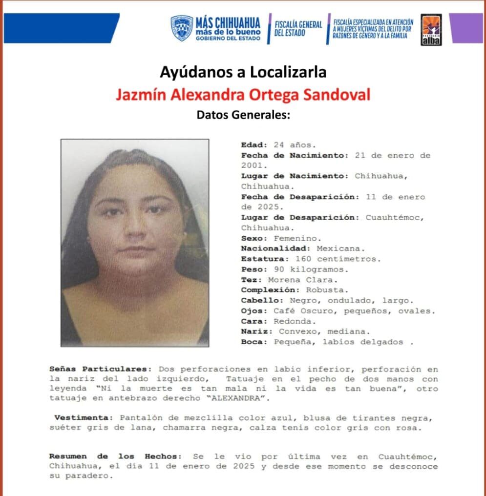 Cuauhtémoc, Chih.-La Fiscalía de la zona occidente emitió la pesquisa para tratar de localizar a Jazmín Alejandra Ortega Sandoval, de 24 años de edad, quien desapareció de Ciudad Cuauhtémoc desde el pasado 11 de enero.