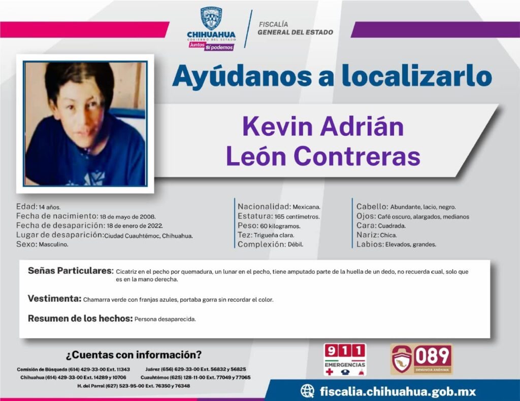 Cuauhtémoc, Chih.-La Fiscalía de la zona occidente pide el apoyo de la población para tratar de dar con el paradero de Kevin Adrián León Contreras, de 14 años de edad, desaparecido en esta ciudad de Cuauhtémoc desde el pasado 18 de enero.