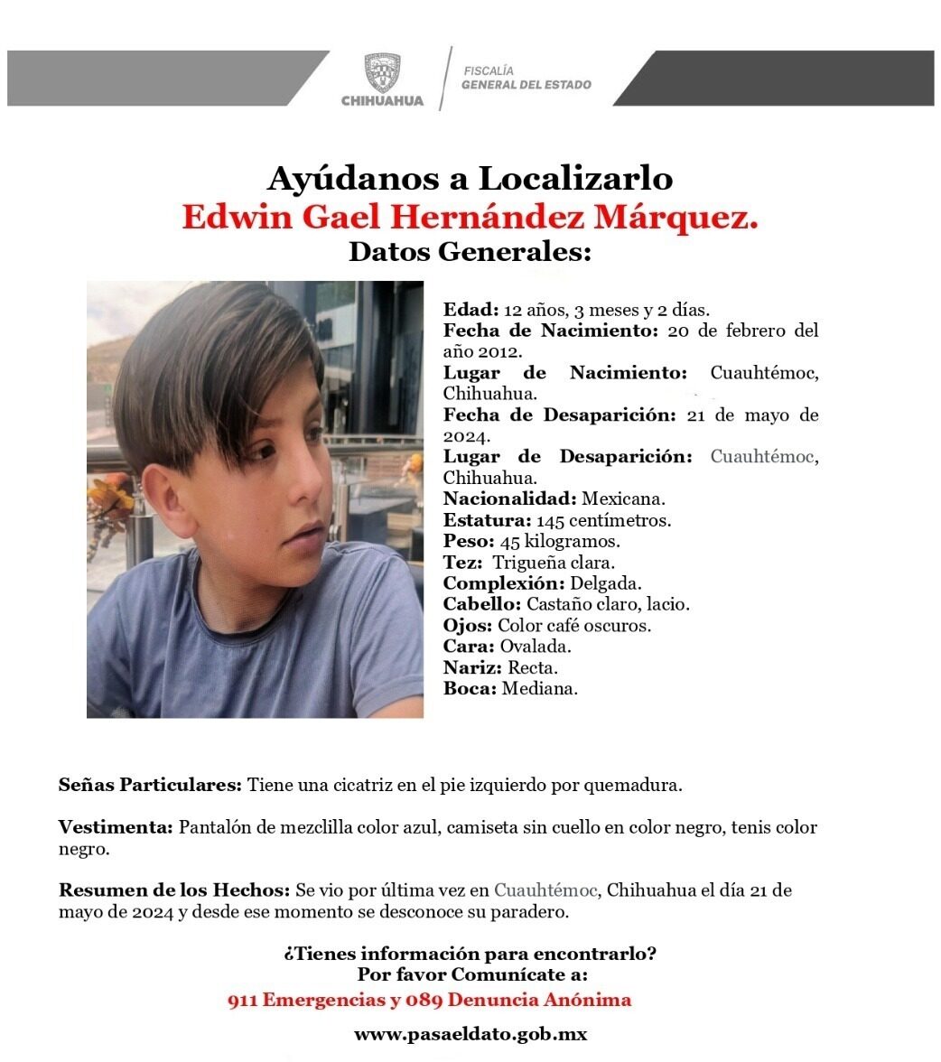 Edwin Gael cuenta con 12 años de edad de, es de 1.45 metros de estatura, 45 kilogramos de peso, tez trigueña clara, complexión delgada, cabello castaño, claro, lacio; ojos cafés, oscuros, cara ovalada, nariz recta, boca media. Tiene una cicatriz en pie izquierdo por quemadura.