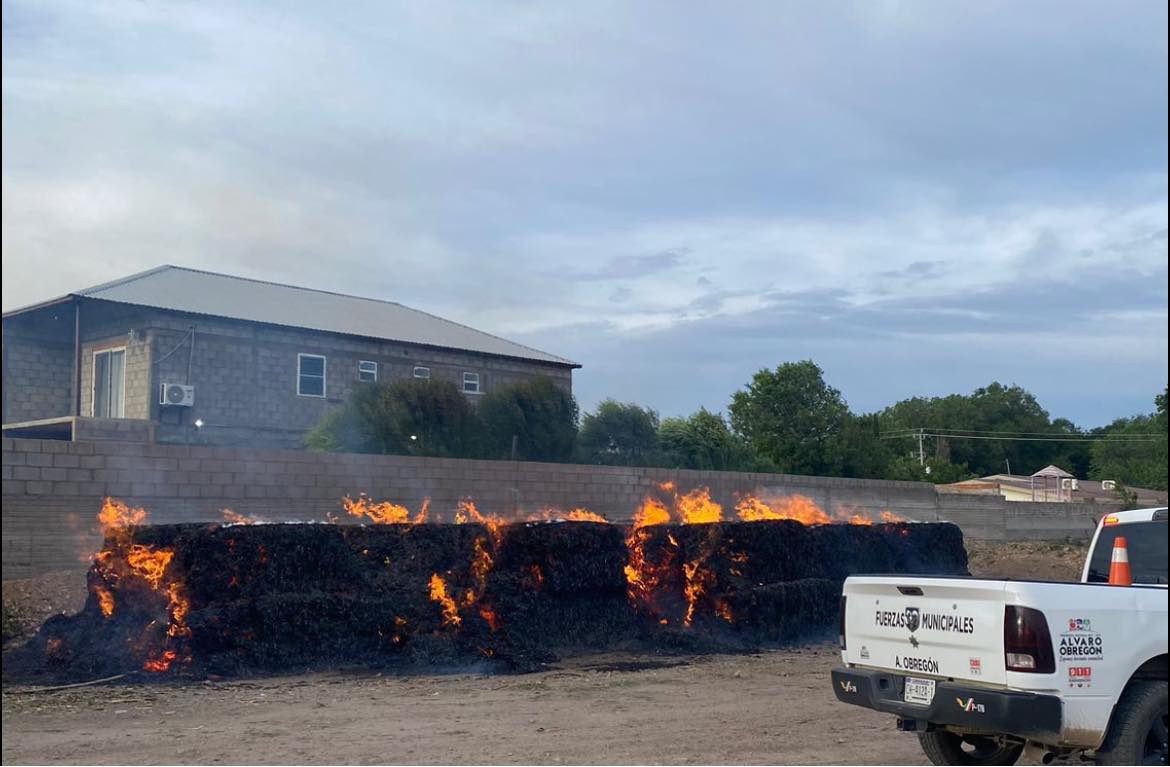 Cuauhtémoc, Chih.-La Policía Seccional de Álvaro Obregón, a través del Mando Único, informó que a las 19:00 horas del 19 de mayo, en la avenida Galeana y calle 10a, de la zona centro de Rubio, había ocurrido un incendio de pacas de pastura.