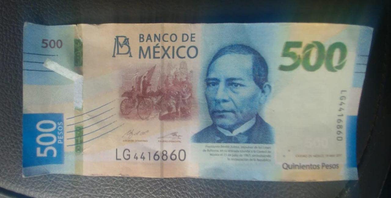 El reportante mostró a los agentes un billete de 500 pesos con número de serie LG4416860, el cual efectivamente se confirmó que era falso, indicando que dicho billete lo obtuvo el día 27 del mes anterior en una sucursal bancaria cuando acudió a cobrar su pensión.