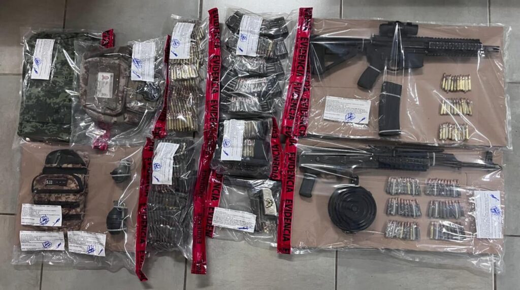 Además, tres cargadores calibre 5. 56 x 45 milímetros con capacidad para 30 cartuchos; dos artefactos bélicos (granadas de fragmentación); 274 cartuchos útiles calibre .223; 420 cartuchos útiles calibre 7.62 x 39 milímetros y una bolsa con dos granadas.