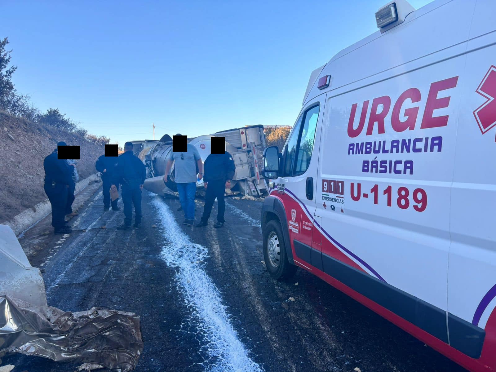 Cuauhtémoc, Chih.-Un tractocamión que transportaba leche registró una volcadura en la carretera a Chihuahua, a 200 metros de la rampa de acceso al libramiento Gómez Morín, a las 17:17 horas del 26 de diciembre, informó la Policía Vial a través del Mando Único.