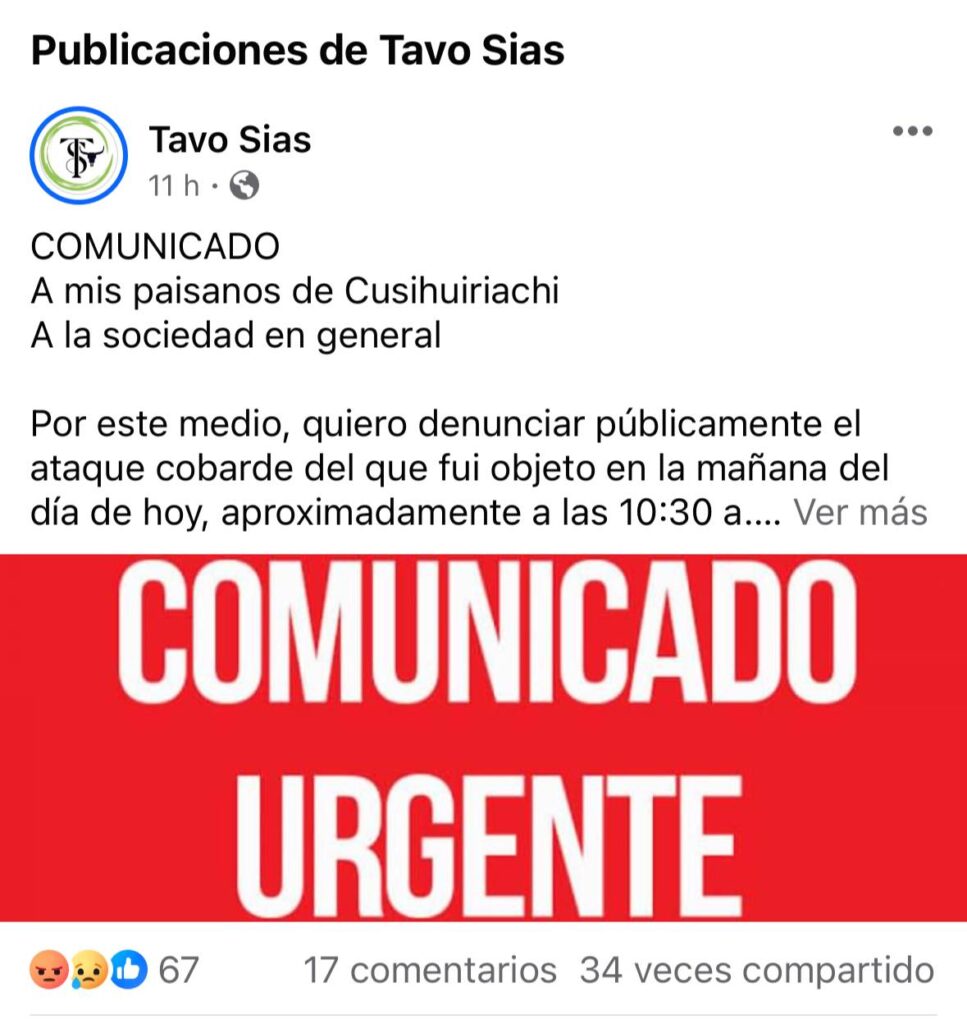Por este medio, quiero denunciar públicamente el ataque cobarde del que fui objeto en la mañana del día de hoy, aproximadamente a las 10:30 a.m. Me abordó un grupo de personas encapuchadas, quiénes me levantaron y golpearon. Me amenazaron para que desista de mi intención de contender por la presidencia del Municipio de Cusihuiriachi en las elecciones que se aproximan. Dijeron que este es solo un aviso, que si insistía en contender me iría peor.