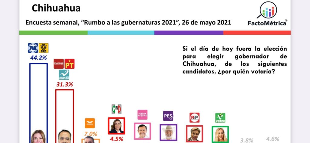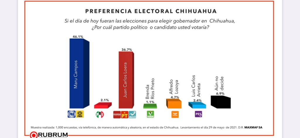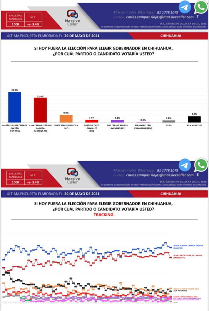 Por su parte, Massive Caller en su encuesta al 29 de Mayo coloca a Maru Campos, candidata de la coalición “Nos Une Chihuahua” (PAN-PRD), a la delantera con 39.7 puntos y el candidato de Morena alcanza solo 32.4%.