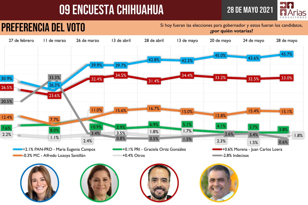 En la medición al 28 de mayo, la encuestadora Arias Consultores da a Maru Campos una ventaja de más de 12 puntos, pues la ubica en la delantera con 45.7%, mientras que en segundo lugar está el candidato de Morena que registra 33 puntos.