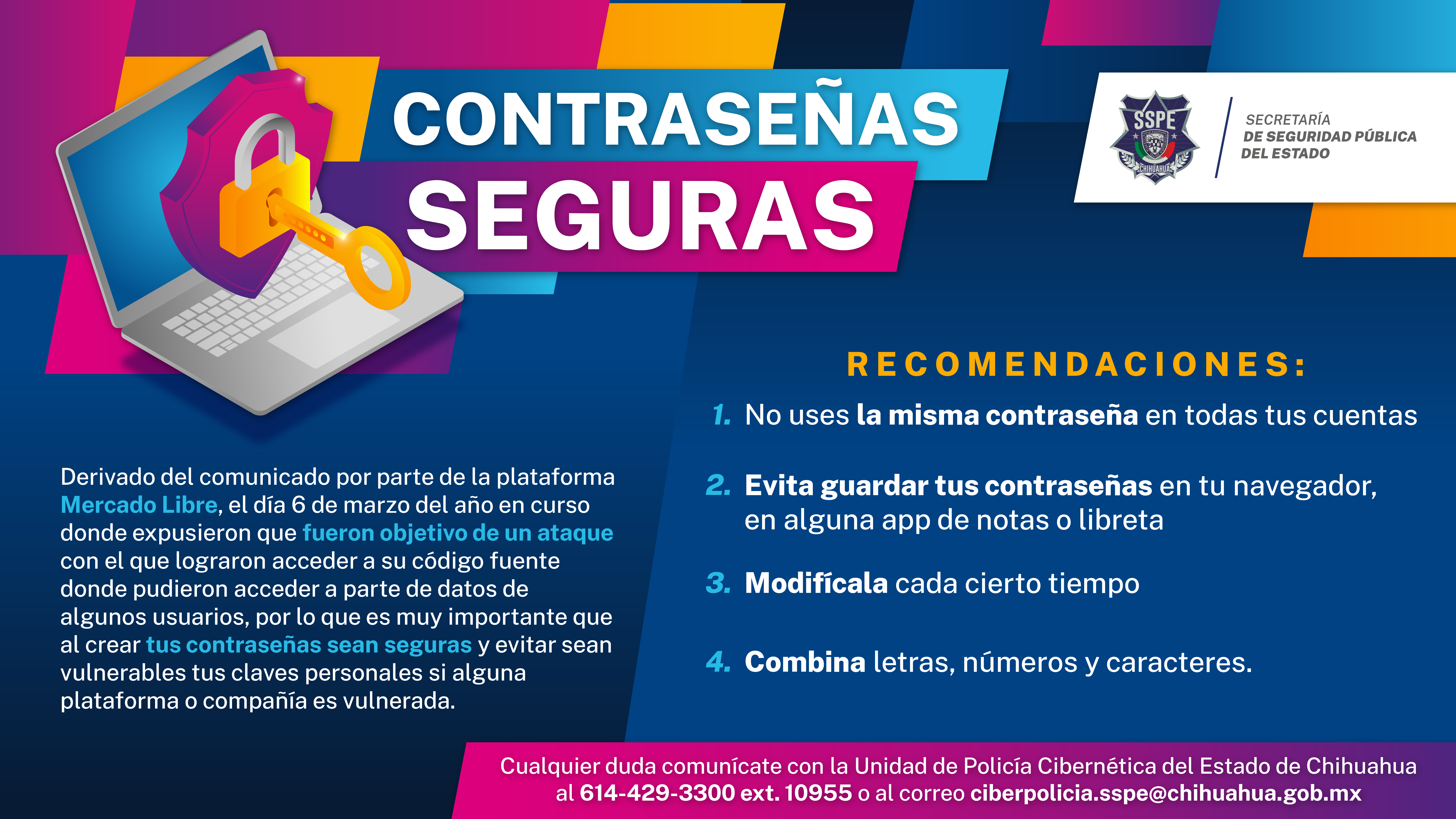 Derivado del ataque que sufrió el sitio Mercado Libre en el mes de marzo, la Secretaría de Seguridad Pública del Estado (SSPE) a través de la Unidad de Policía Cibernética, alertó a la población para renovar sus contraseñas constantemente.