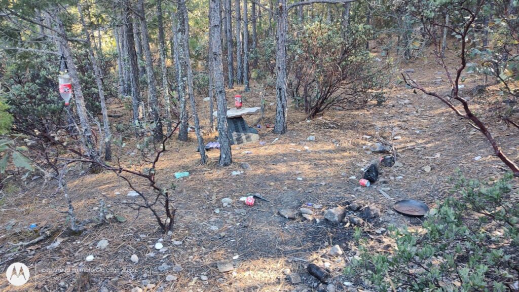 Los elementos de Zonas Rurales ubicaron indicios de personas armadas en la comunidad Mesa del Sombrero, municipio de Urique por lo que realizaron un patrullaje pedestre en el que localizaron el campamento habilitado con colchonetas, cobijas, hules, celdas solares y alimentos así como varios parapetos de piedra.