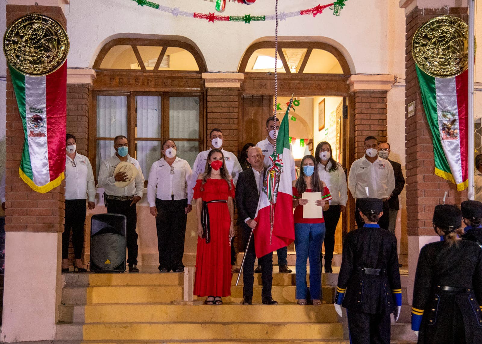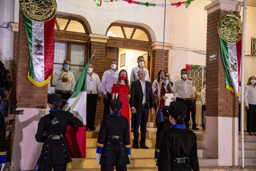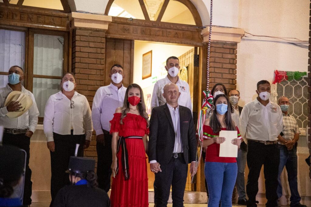 En punto de las 11 de la noche, el Alcalde Iván Alejandro Gutiérrez Villarreal realizó la tradicional arenga acompañado de su esposa y Presidenta del Dif Municipal, Flor Cristina Orozco Granados, la Síndico Maria Guadalupe Terán Rascón, regidores del Honorable Ayuntamiento y funcionarios.