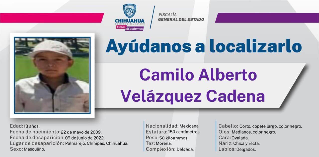 Cuauhtémoc, Chih.-Se solicita la ayuda de la población en general para tratar de dar con el paradero del menor, Camilo Alberto Velázquez Cadena, de 13 años de edad, quien se encuentra desaparecido desde el pasado 09 de Junio, cuando salió de su domicilio en la comunidad de Palmarejo en el municipio de Chínipas.