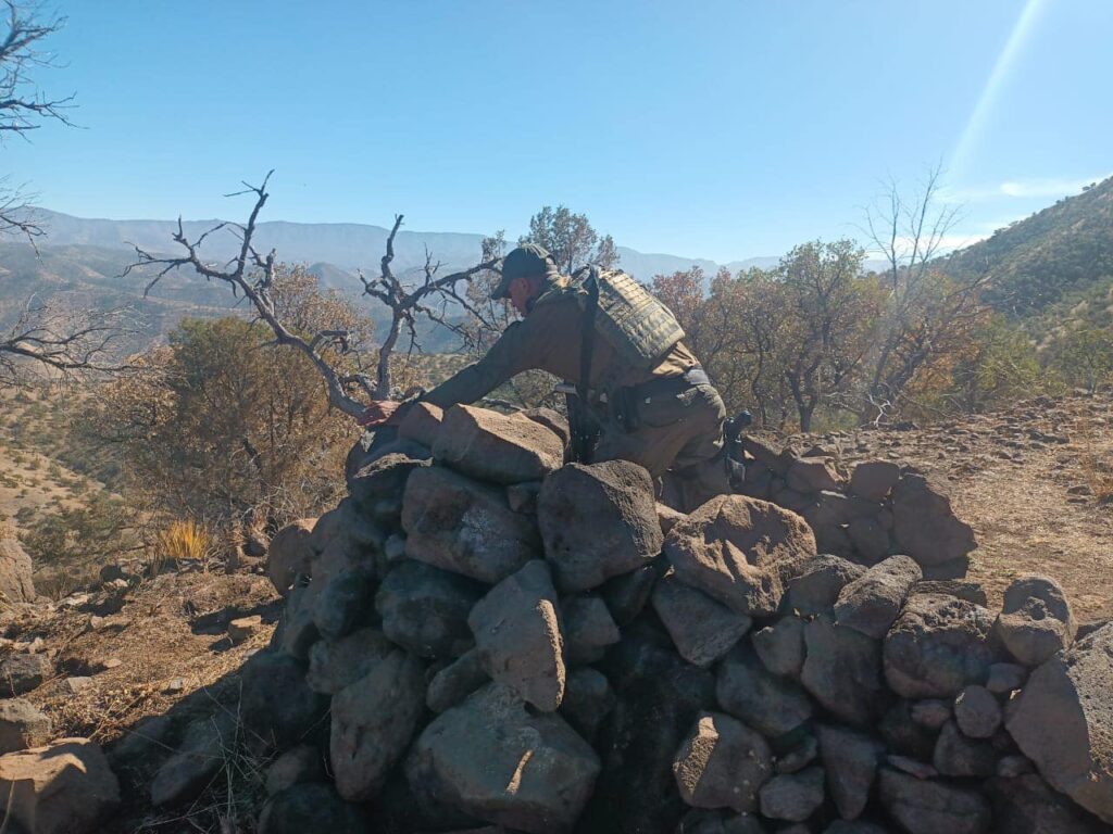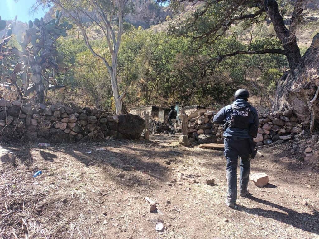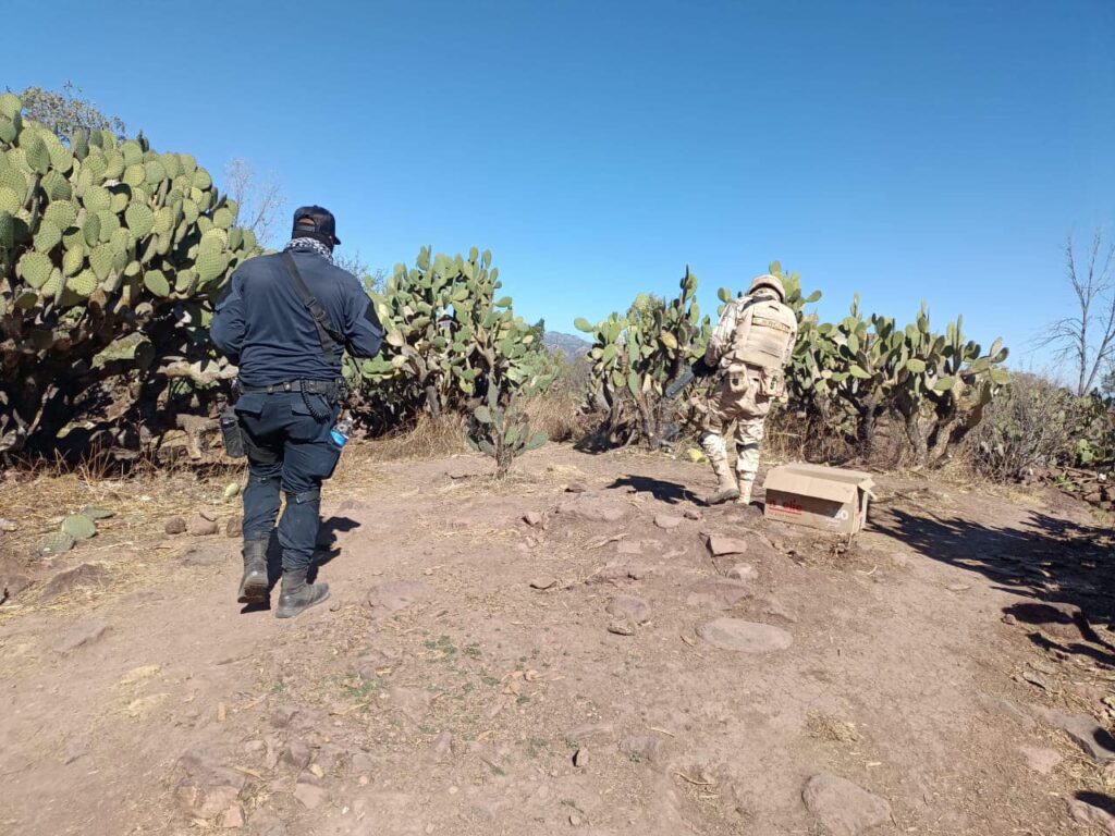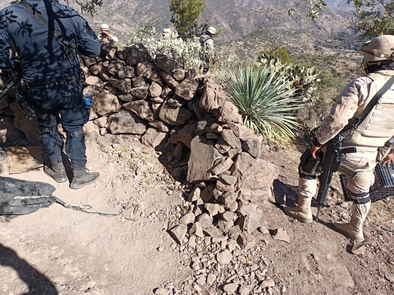 Al realizar recorridos por los cerros aledaños, los elementos de la SSPE, Sedena y AEI fueron localizando los campamentos en los que había ropa, hules, alimentos, cargadores, cartuchos útiles y percutidos de diversos calibres y parapetos de piedras.