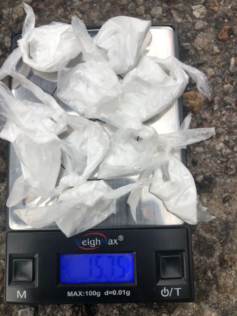 Una vez asegurados, se les aseguró 2 armas largas calibre .223, un arma corta calibre .45, además de 10 porciones de un polvo blanco similar a la cocaína y 5 paquetes de plástico que contenían una hierba seca, verde y olorosa con las características propias de la mariguana.