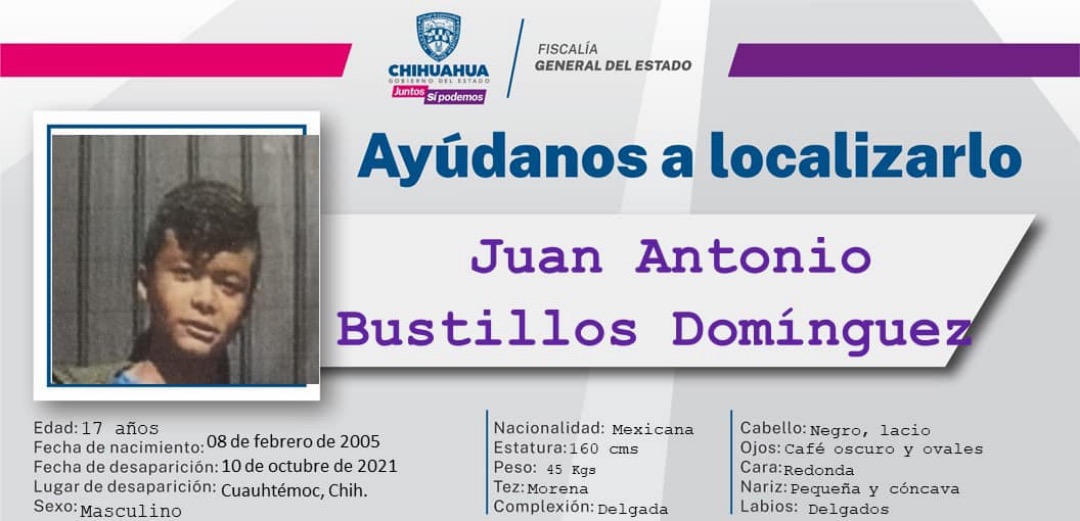 Cuauhtémoc, Chih.- A través de una comunicación oficial, la Fiscalía de la zona occidente está solicitando la colaboración de la población en general para tratar de dar con el paradero de Juan Antonio Bustillos Domínguez, de 17 años de edad, quien se encuentra desaparecido desde el pasado 10 de octubre.