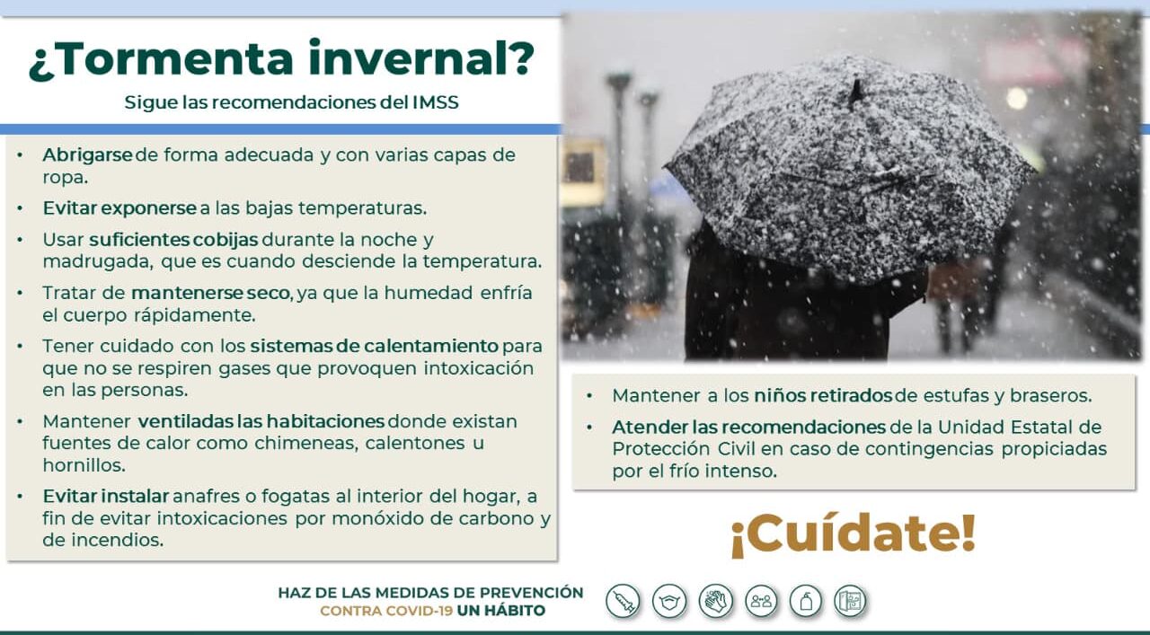 Ante la prevalencia de los pronósticos de frío intenso e incluso de la presencia de una tormenta invernal en las próximas horas en la entidad, el Instituto Mexicano del Seguro Social (IMSS) en Chihuahua emite las siguientes recomendaciones a la población en general.