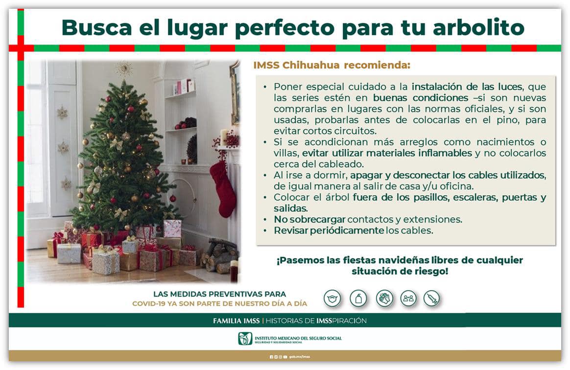 El Instituto Mexicano del Seguro Social (IMSS) en Chihuahua, recomienda a la población mantener las medidas de seguridad con el uso del árbol navideño, ya que los materiales que lo componen son altamente inflamables, por lo que fácilmente pueden causar un incendio en caso de un corto circuito.