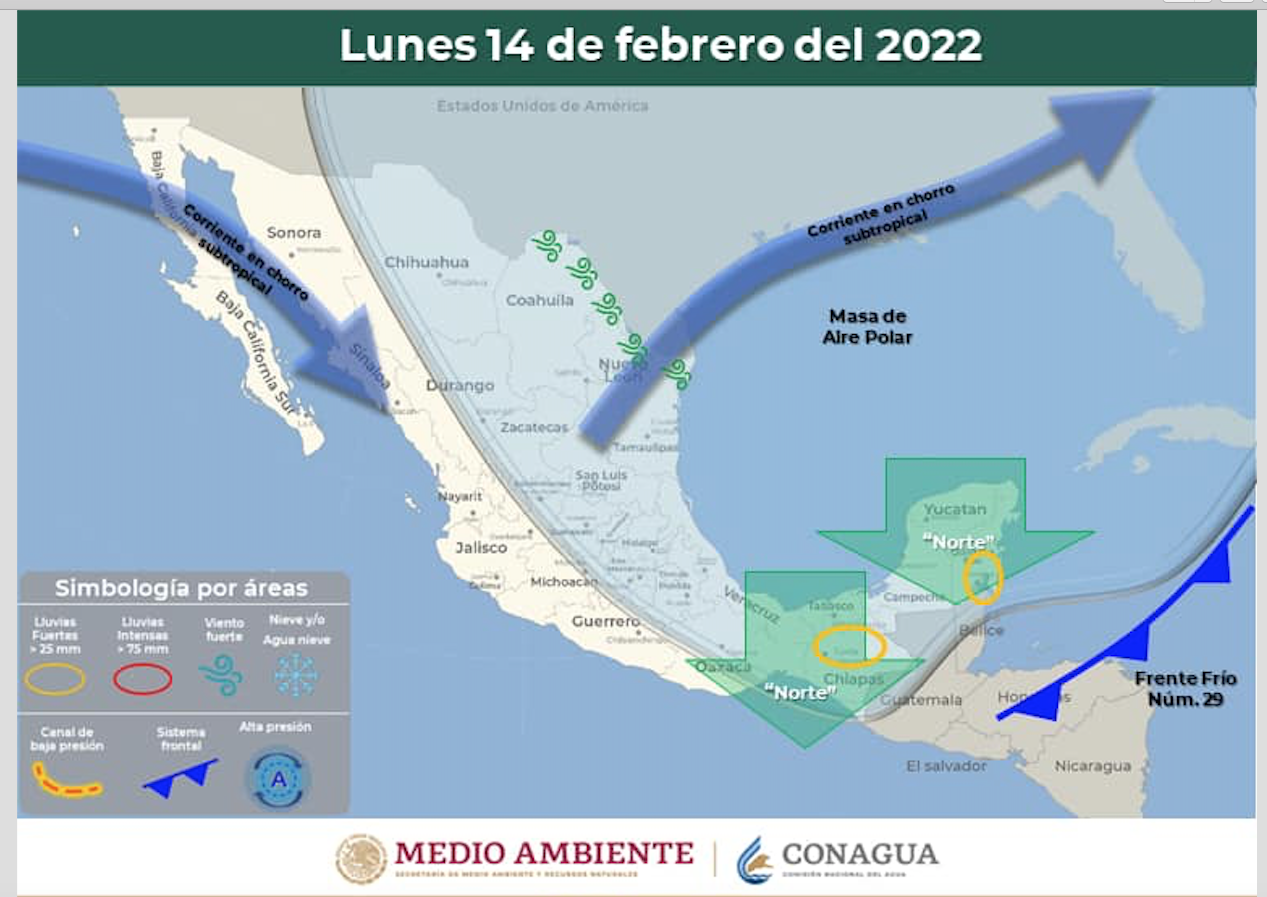 Mientras para este próximo miércoles 16, el frente frío número 30 se ubicará al noroeste del país en interacción con una vaguada polar, la corriente en chorro y una línea seca sobre Coahuila favorecerá a la presencia de fuertes rachas de viento que pueden alcanzar hasta los 85 y 95 km/h.
