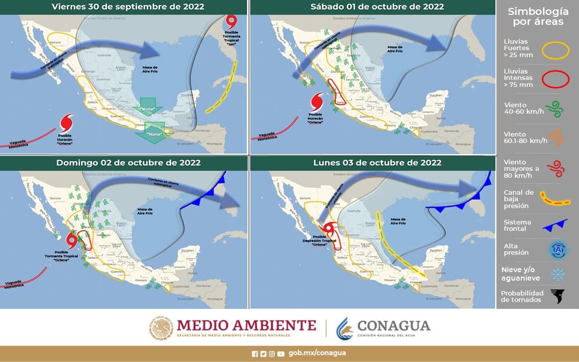 Además, dio a conocer que remanentes de la Tormenta “Orlene” y sus desprendimientos nubosos provocarán lluvias en la zona occidental del territorio estatal a partir de la tarde de este viernes.