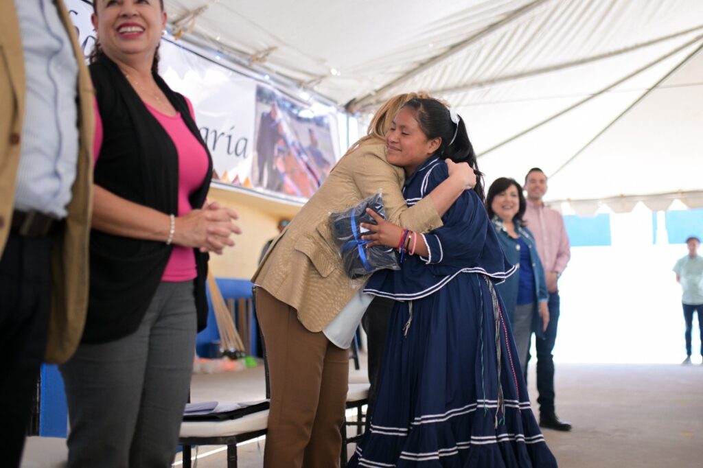 En un primer acto, la mandataria estatal, acompañada de la secretaria de Educación y Deporte, Sandra Gutiérrez Fierro y del secretario de Pueblos y Comunidades Indígenas, Enrique Rascón, distribuyó de forma simbólica becas, uniformes escolares, y libros para las niñas y niños de escuelas de la región.