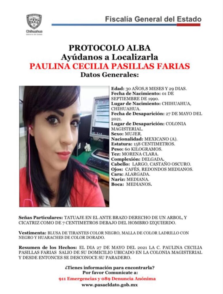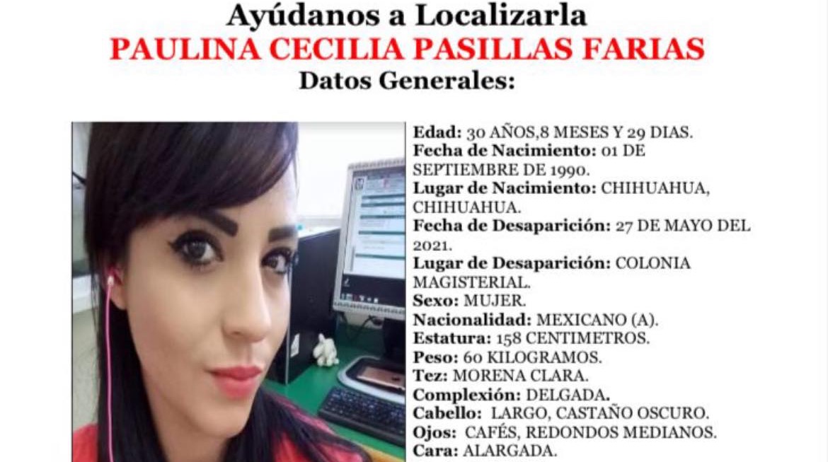 Se solicita la colaboración de la población en general para tratar de dar con el paradero de Paulina Cecilia Pasillas Farías, quien fue vista por última ocasión el 27 de mayo de 2021 en la Ciudad de Chihuahua.