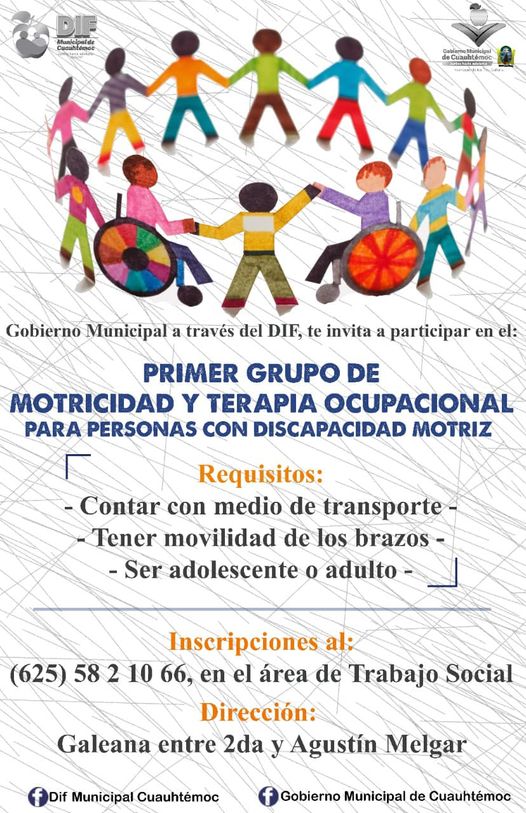 El Gobierno Municipal de Cuauhtémoc a través del Sistema DIF emitió una convocatoria para las personas con discapacidad motriz que requieran participar en el primer taller de terapias de motricidad y ocupacionales que dispone la Unidad Básica de Rehabilitación-UBR- recién puesta en marcha.